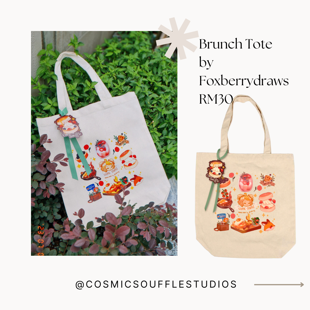 Tote your daily necessities deliciously in brunch aesthetic with foxberrydraws' Brunch Tote! Printed onto cotton canvas tote, dimensions are 34cm(w) x 42cm(h), tote strap hangs approximately at 21cm length. Spot clean by hand, or gently wash in a bucket of soapy water and let air dry. If need be, iron on the opposite cloth side of the print, never directly on the print itself.