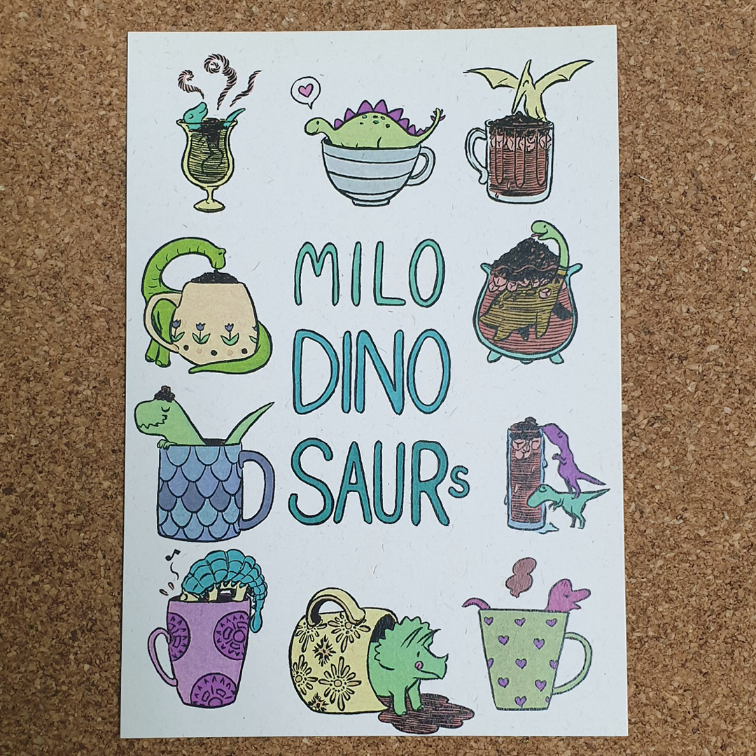 Summary: Just cute dinosaurs enjoying a perennial favourite mamak drink. This A6-sized print on recycled matte artcard will hit the sweet spot as a gift to your milo-loving self or loved ones.