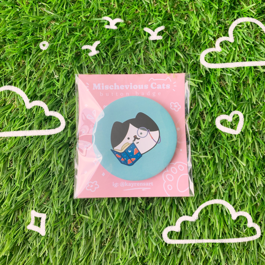 Kayren's Art Mischevious Cats Button Badge - Reading Cat