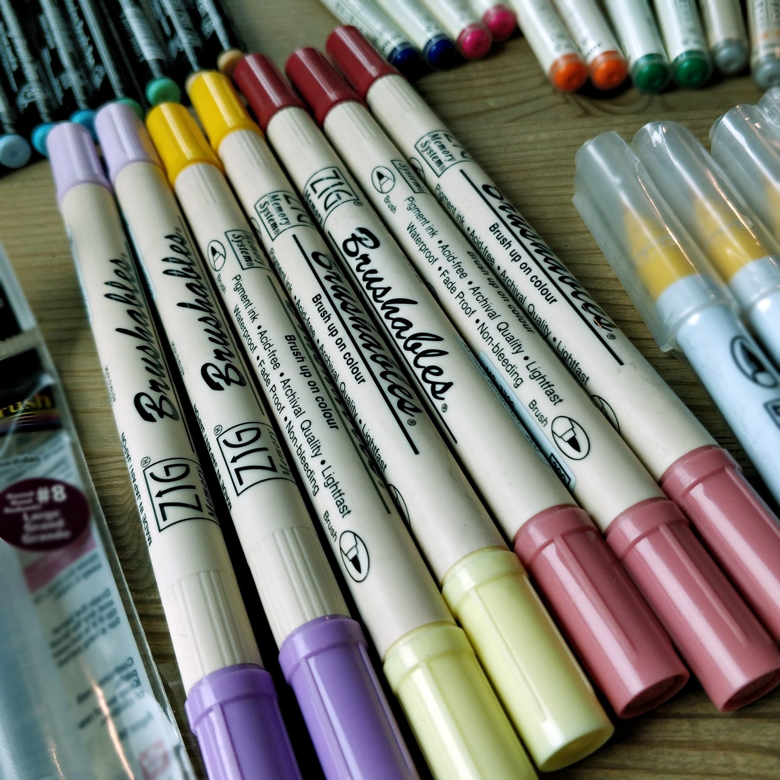 ZIG Brushables are a flexible felt tip, two-toned pen, great for brush techniques and for creating two-toned blending effects. Pens are acid-free, photo safe, and have two tones per marker.